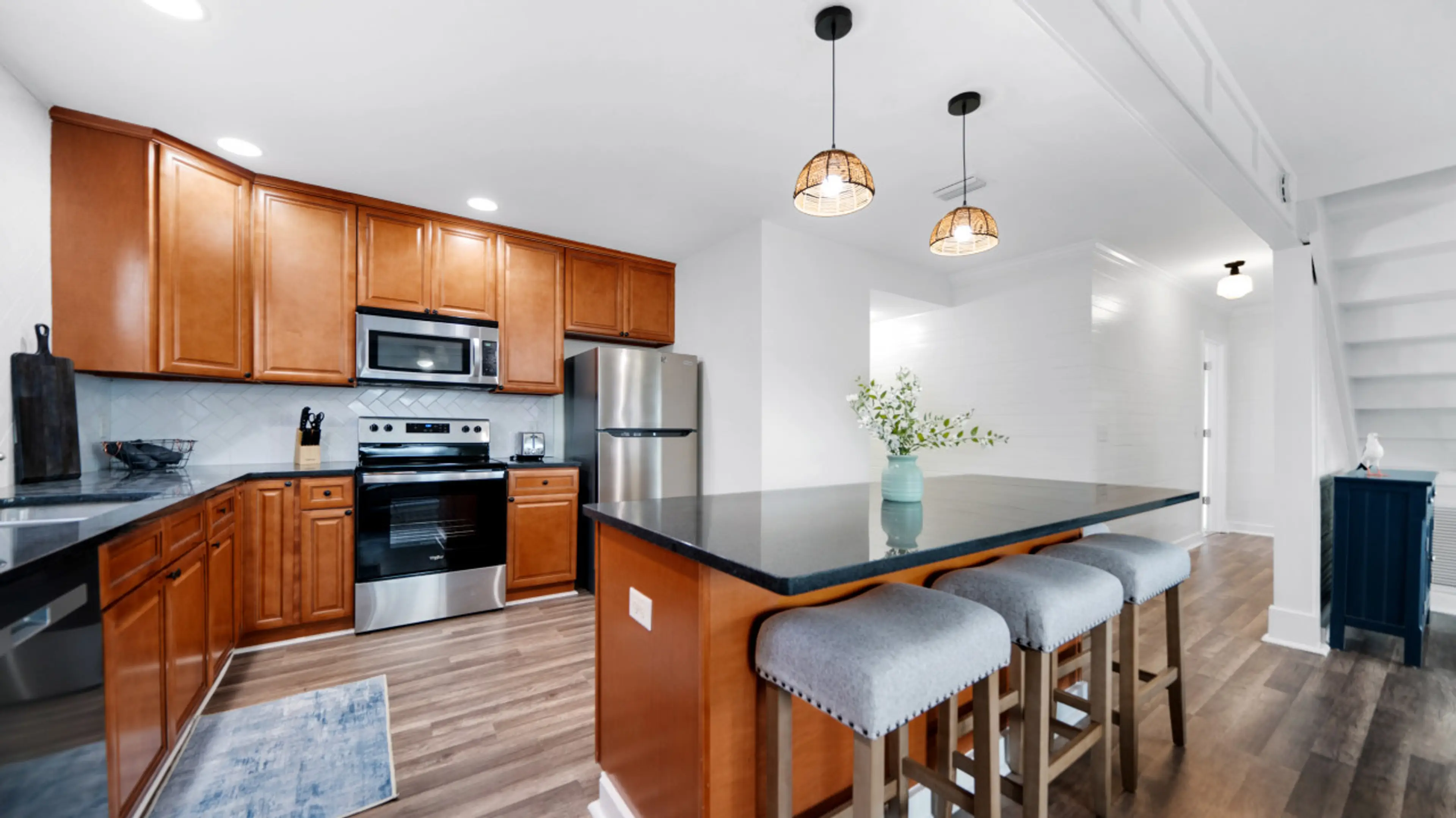 At 1st it took getting use to, then once everyone settle in, we loved it..5 bdrms, pool and 50 steps to the beach..And to top all of this off they have a Blackstone grill, never seen that at a vacation rental..Hostess was also wonderful!!